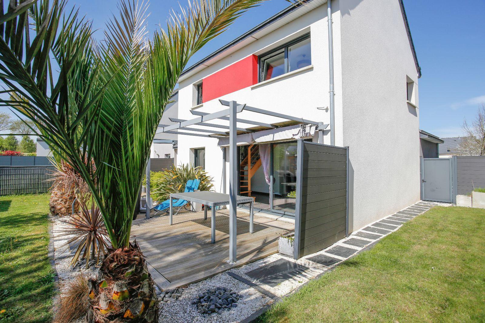Extérieur : terrasse bois aménagée et terrain paysagé sans vis-à-vis.